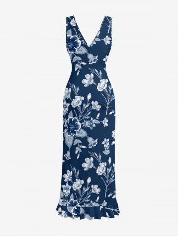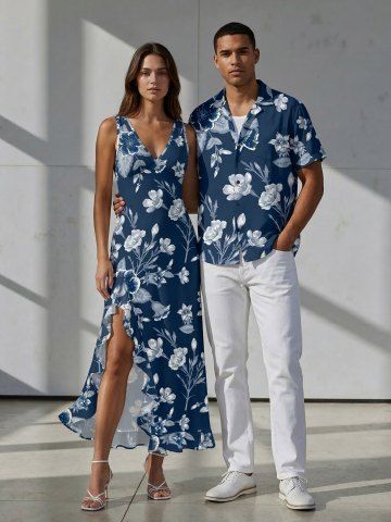 Flowers Leaf Print Matching Hawaii Beach Outfit For Couples - Cadetblue