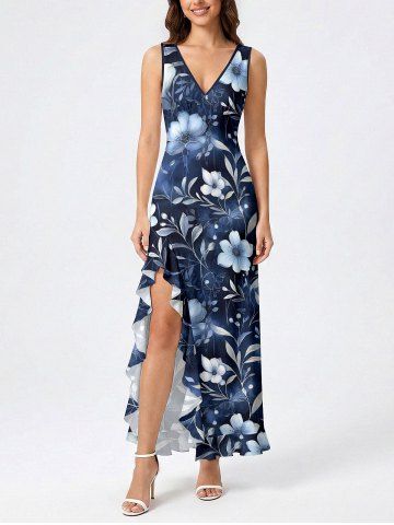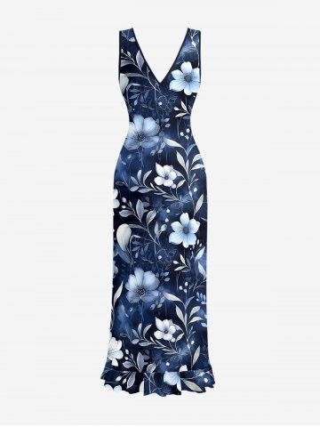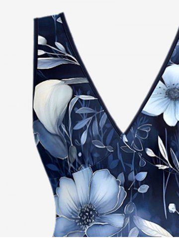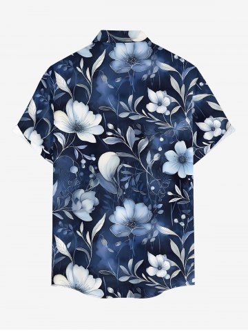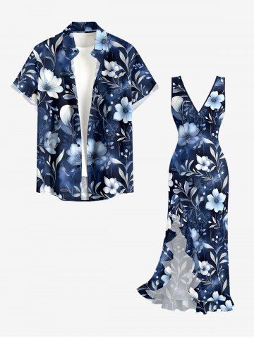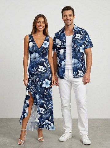 Flowers Leaf Print Matching Hawaii Beach Outfit For Couples - Deep Blue
