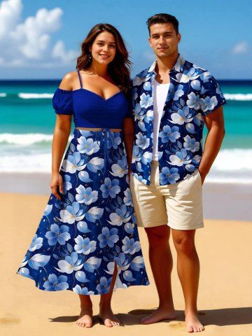 Matching Hawaiian Outfits > Flowers Leaf Print Plus Size Matching Hawaii Beach Outfit For Couples