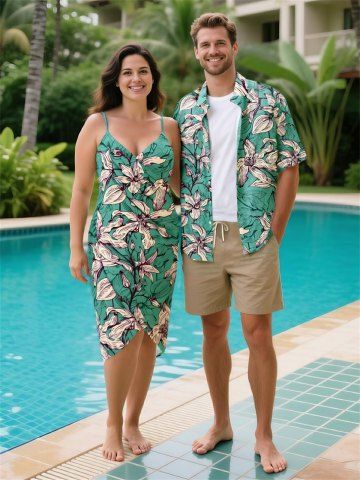 Matching Hawaiian Outfits > Flowers Leaf Print Plus Size Matching Hawaii Beach Outfit For Couples