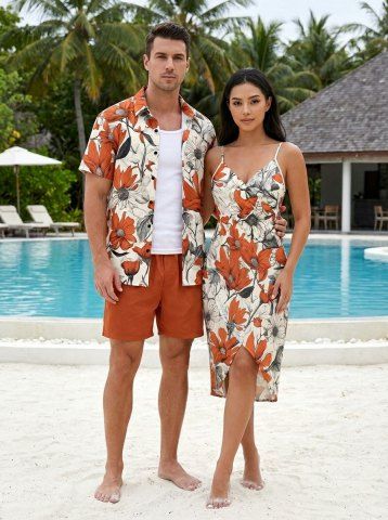 Matching Hawaiian Outfits > Flowers Leaf Print Plus Size Matching Hawaii Beach Outfit For Couples