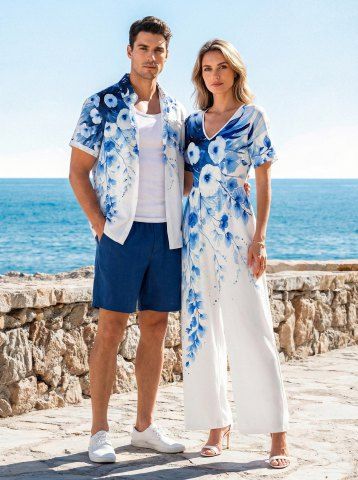 Matching Hawaiian Outfits > Flowers Leaf Print Plus Size Matching Hawaii Beach Outfit For Couples