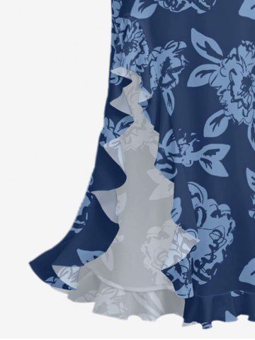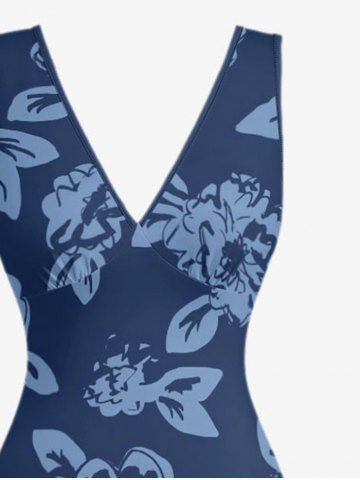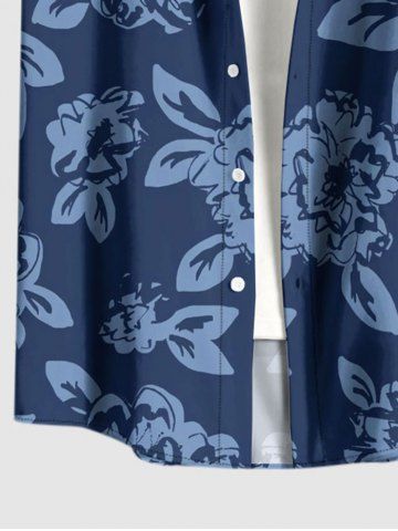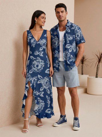 Flowers Leaf Print Plus Size Matching Hawaii Beach Outfit For Couples - Deep Blue