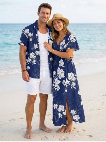 Flowers Leaf Print Plus Size Matching Hawaii Beach Outfit For Couples - Deep Blue