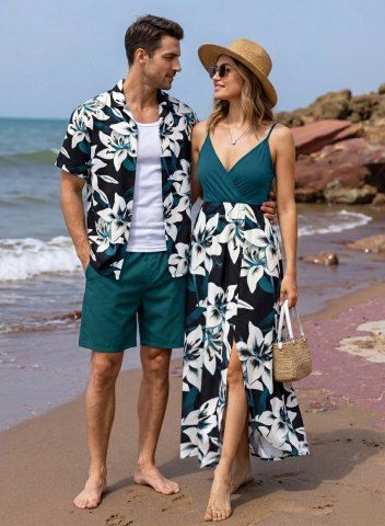 Matching Hawaiian Outfits > Flowers Leaf Print Plus Size Matching Hawaii Beach Outfit For Couples