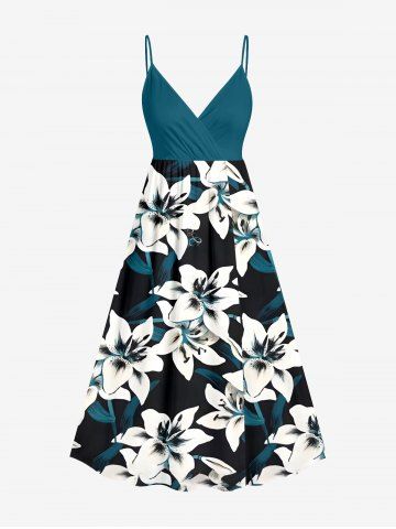 Flowers Leaf Print Plus Size Matching Hawaii Beach Outfit For Couples - Peacock Blue