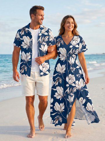 Matching Hawaiian Outfits > Flowers Leaf Print Plus Size Matching Hawaii Beach Outfit For Couples