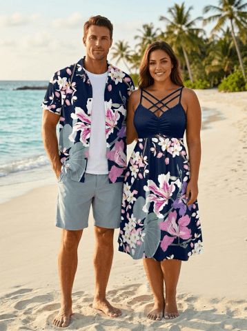 Matching Hawaiian Outfits > Flowers Leaf Print Plus Size Matching Hawaii Beach Outfit For Couples