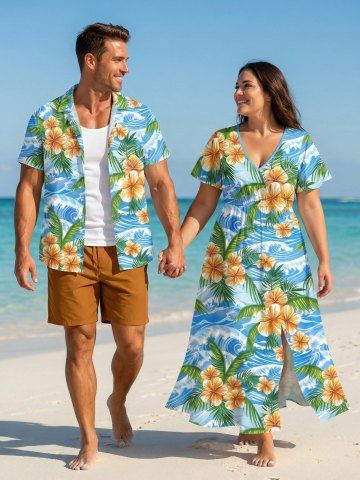 Matching Hawaiian Outfits > Flowers Leaf Sea Waves Print Plus Size Matching Hawaii Beach Outfit For Couples
