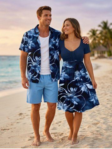 Matching Hawaiian Outfits > Flowers Leaf Tie Dye Print Plus Size Matching Hawaii Beach Outfit For Couples