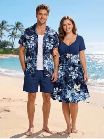 Flowers Leaf Tie Dye Print Plus Size Matching Hawaii Beach Outfit For Couples - Deep Blue