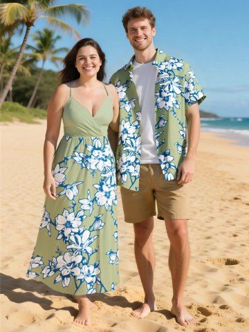 Matching Hawaiian Outfits > Flowers Leaf Tropical Print Plus Size Matching Hawaii Beach Outfit For Couples
