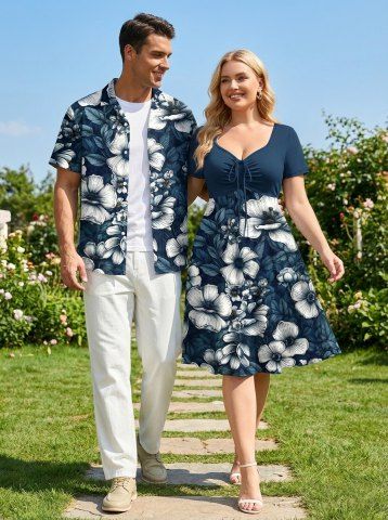 Matching Hawaiian Outfits > Flowers Leaf Tropical Print Plus Size Matching Hawaii Beach Outfit For Couples