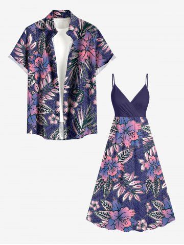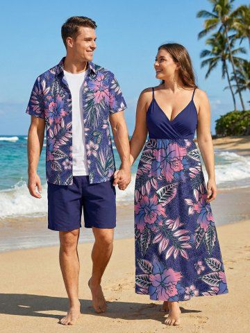 Matching Hawaiian Outfits > Flowers Leaf Tropical Print Plus Size Matching Hawaii Beach Outfit For Couples