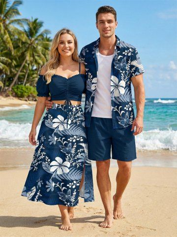 Matching Hawaiian Outfits > Flowers Leaf Tropical Print Plus Size Matching Hawaii Beach Outfit For Couples