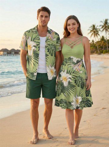 Matching Hawaiian Outfits > Flowers Leaf Tropical Print Plus Size Matching Hawaii Beach Outfit For Couples