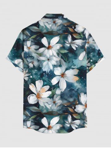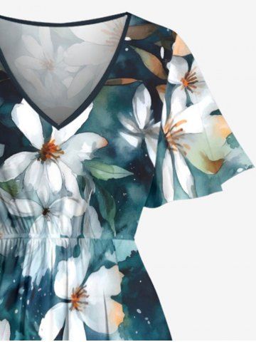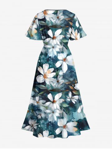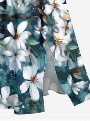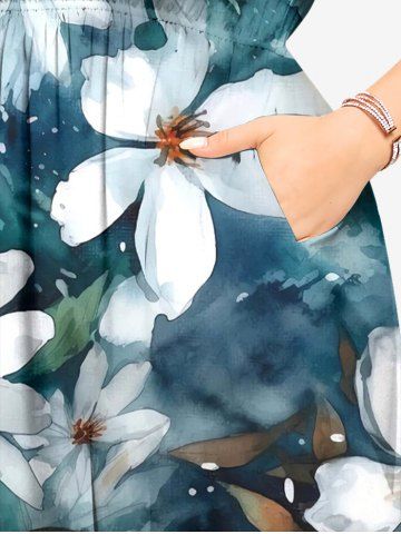 Flowers Leaf Watercolor Print Plus Size Matching Hawaii Beach Outfit For Couples - Peacock Blue