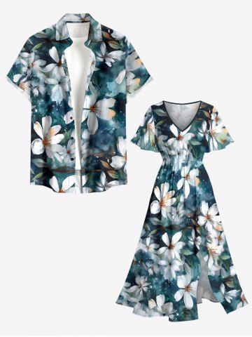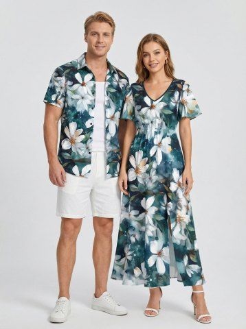 Matching Hawaiian Outfits > Flowers Leaf Watercolor Print Plus Size Matching Hawaii Beach Outfit For Couples