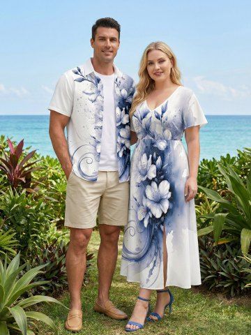 Matching Hawaiian Outfits > Flowers Paint Splatter Print Plus Size Matching Hawaii Beach Outfit For Couples