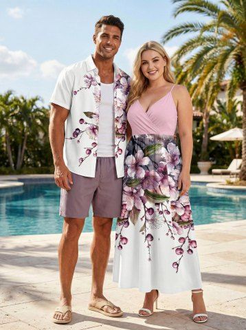 Matching Hawaiian Outfits > Flowers Print Plus Size Matching Hawaii Beach Outfit For Couples