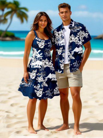 Matching Hawaiian Outfits > Flowers Tropical Leaf Coconut Tree Print Plus Size Matching Hawaii Beach Outfit For Couples