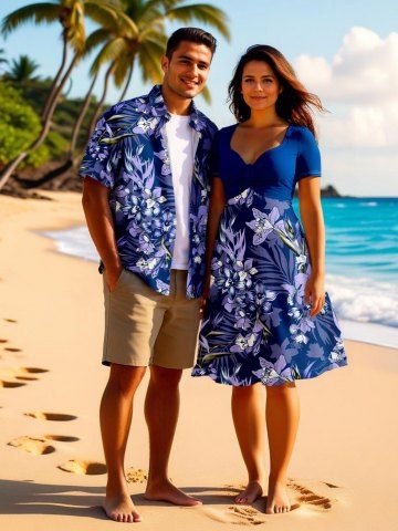 Matching Hawaiian Outfits > Flowers Tropical Leaf Print Plus Size Matching Hawaii Beach Outfit For Couples