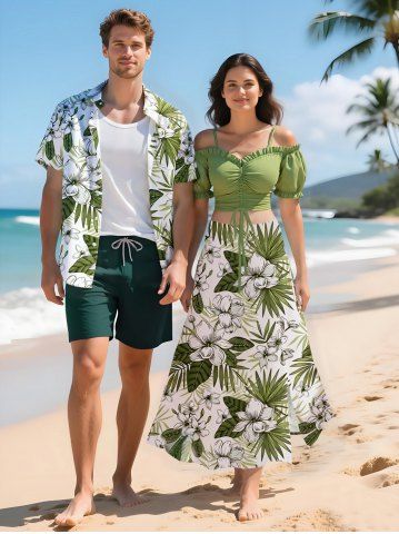 Matching Hawaiian Outfits > Flowers Tropical Leaf Print Plus Size Matching Hawaii Beach Outfit For Couples