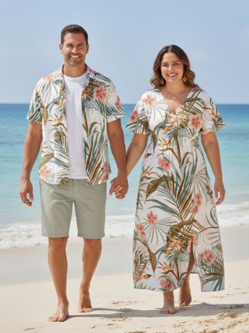 Matching Hawaiian Outfits > Flowers Tropical Leaf Print Plus Size Matching Hawaii Beach Outfit For Couples