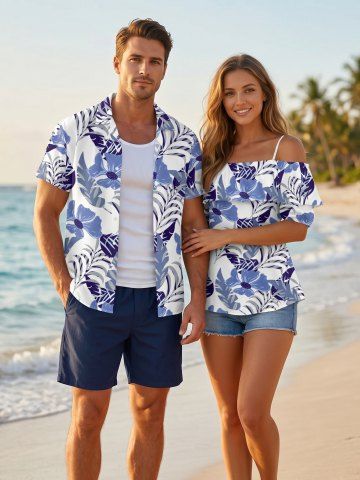 Matching Hawaiian Outfits > Flowers Tropical Leaf Print Plus Size Matching Hawaii Beach Outfit For Couples
