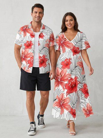Matching Hawaiian Outfits > Flowers Tropical Leaf Print Plus Size Matching Hawaii Beach Outfit For Couples
