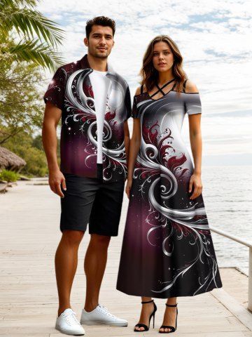 Matching Hawaiian Outfits > Galaxy Floral Leaf Print Plus Size Matching Hawaii Beach Outfit For Couples