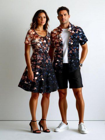 Matching Hawaiian Outfits > Glitter Galaxy Sequins Print Plus Size Matching Hawaii Beach Outfit For Couples