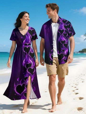 Matching Hawaiian Outfits > Heart Fire Flame Print Plus Size Matching Hawaii Beach Outfit For Couples
