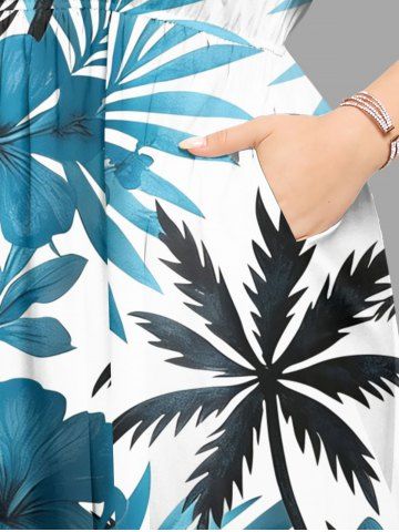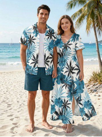 Matching Hawaiian Outfits > Hibiscus Flower Leaf Coconut Tree Print Plus Size Matching Hawaii Beach Outfit For Couples