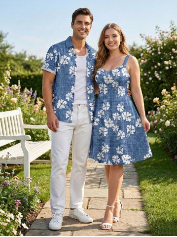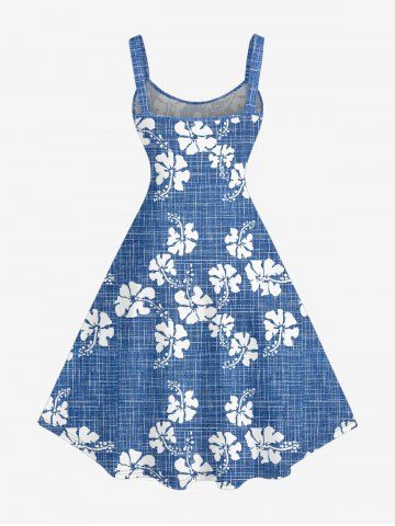 Hibiscus Flower Plaid Print Plus Size Matching Hawaii Beach Outfit For Couples - Denim Blue