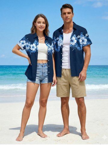 Matching Hawaiian Outfits > Hibiscus Flower Tropical Leaf Print Matching Hawaii Beach Outfit For Couples
