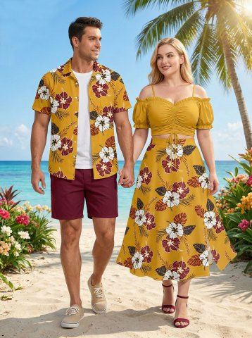 Matching Hawaiian Outfits > Hibiscus Flower Tropical Leaf Print Plus Size Matching Hawaii Beach Outfit For Couples