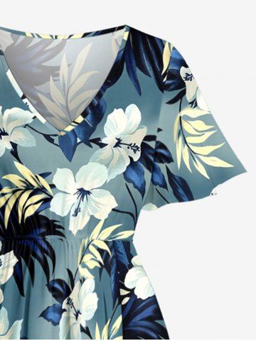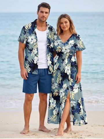 Matching Hawaiian Outfits > Hibiscus Flower Tropical Leaf Print Plus Size Matching Hawaii Beach Outfit For Couples