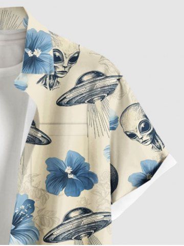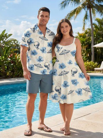 Matching Hawaiian Outfits > Hibiscus Flowers Alien UFO Print Plus Size Matching Hawaii Beach Outfit For Couples