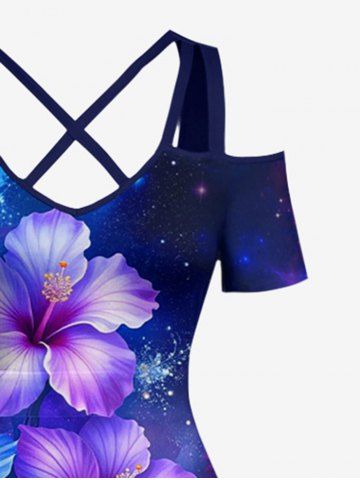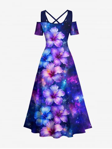 Hibiscus Flowers Galaxy Print Plus Size Matching Hawaii Beach Outfit For Couples - Deep Blue