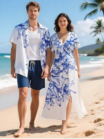 Matching Hawaiian Outfits > Hibiscus Flowers Leaf Print Plus Size Matching Hawaii Beach Outfit For Couples