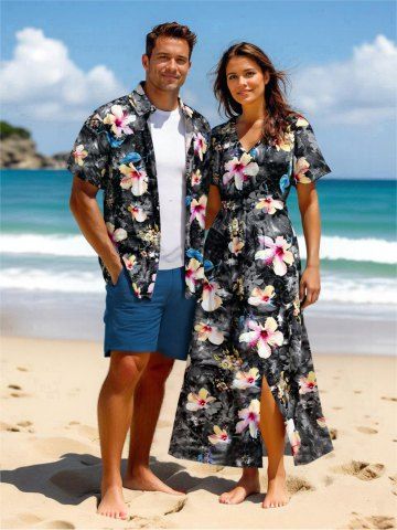 Matching Hawaiian Outfits > Hibiscus Flowers Leaf Print Plus Size Matching Hawaii Beach Outfit For Couples
