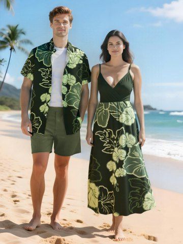 Matching Hawaiian Outfits > Hibiscus Flowers Leaf Print Plus Size Matching Hawaii Beach Outfit For Couples