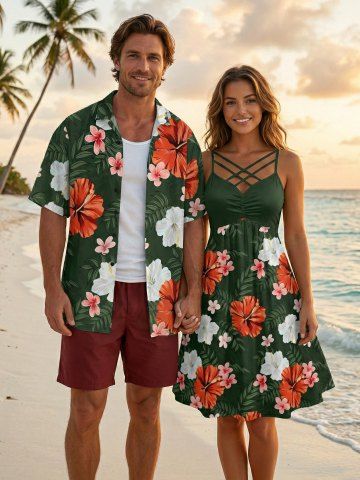 Matching Hawaiian Outfits > Hibiscus Flowers Leaf Print Plus Size Matching Hawaii Beach Outfit For Couples
