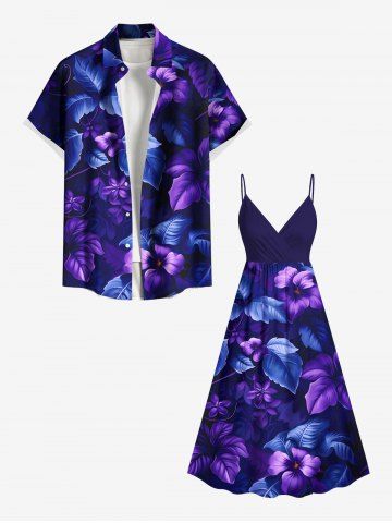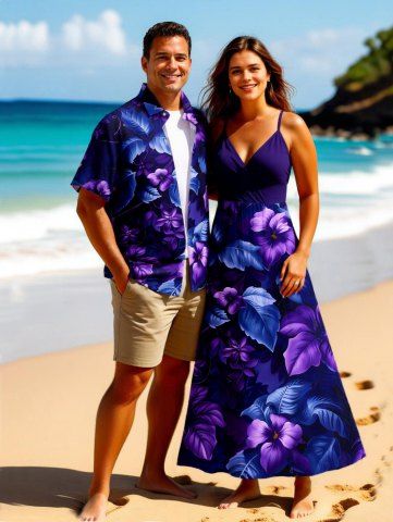 Matching Hawaiian Outfits > Hibiscus Flowers Leaf Tropical Print Plus Size Matching Hawaii Beach Outfit For Couples