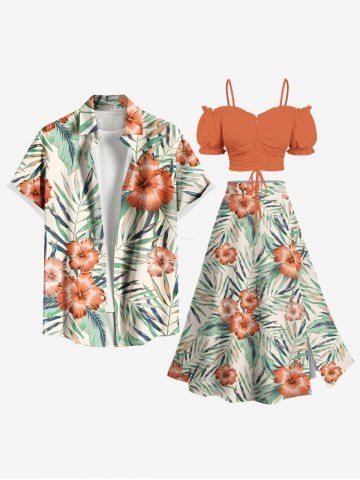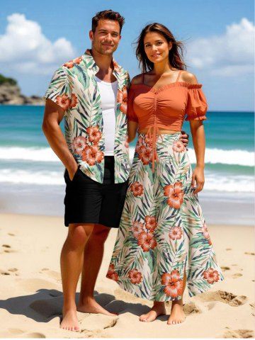 Matching Hawaiian Outfits > Hibiscus Flowers Tropical Leaf Print Plus Size Matching Hawaii Beach Outfit For Couples