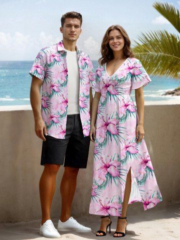 Matching Hawaiian Outfits > Hibiscus Flowers Tropical Leaf Print Plus Size Matching Hawaii Beach Outfit For Couples