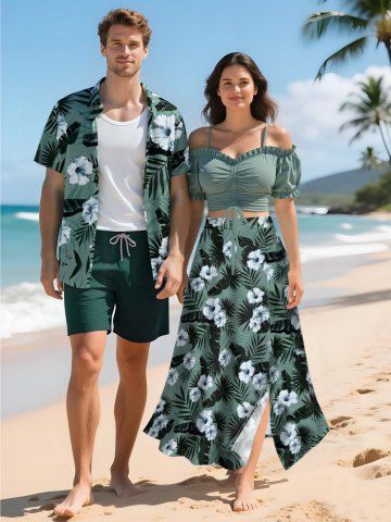 Matching Hawaiian Outfits > Hibiscus Flowers Tropical Leaf Print Plus Size Matching Hawaii Beach Outfit For Couples
