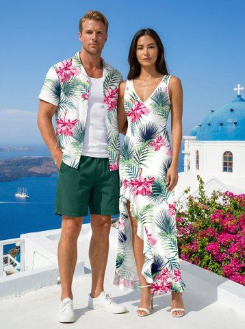 Matching Hawaiian Outfits > Hibiscus Flowers Tropical Leaf Print Plus Size Matching Hawaii Beach Outfit For Couples