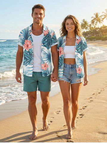 Matching Hawaiian Outfits > Hibiscus Flowers Tropical Leaf Print Matching Hawaii Beach Outfit For Couples